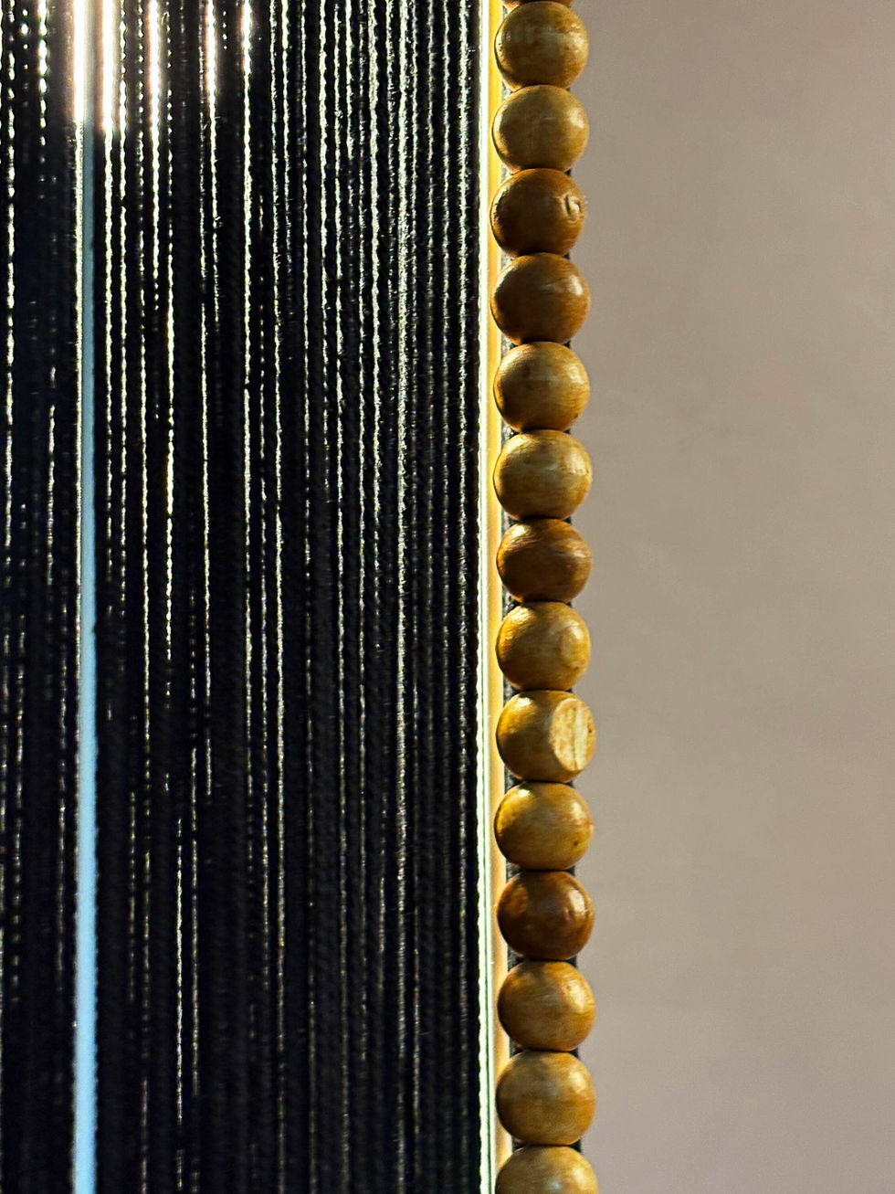 Tall and slender, this pendant is wrapped in deep black cotton thread and finished with a vertical line of wooden beads. Its cylindrical shape casts a focused glow, adding quiet elegance to any space.